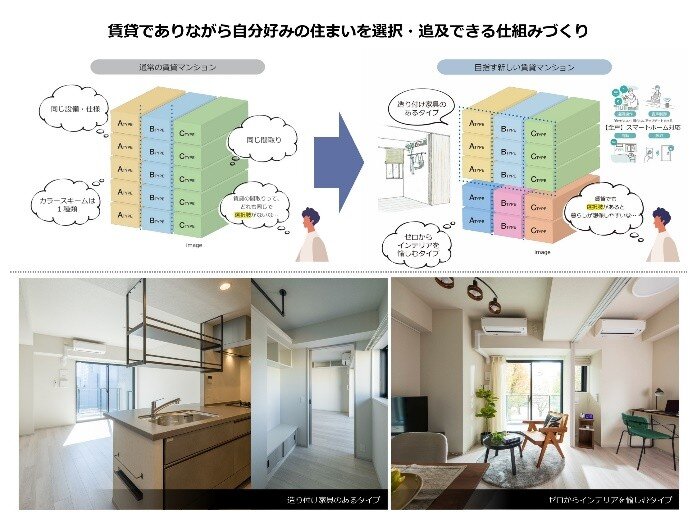 - 階ごとに異なる住戸内装設計、造作家具の有無を選択して入居できる仕組み