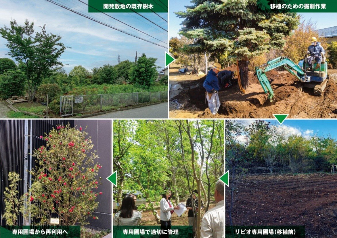 当社の開発敷地には多くの既存樹木があり、従来は建物計画の効率性等の観点からその多くを伐採していました。しかし、環境保全・廃棄物削減・アップサイクルの視点から見直すこととし、既存樹木の専用圃場を設け、移植・再資源化の選択肢を拡充し、都市部と郊外で緑を融通する仕組みを構築しました。これにより、持続可能な開発と社会的責任を両立させるべく全社的に取り組んでいます。